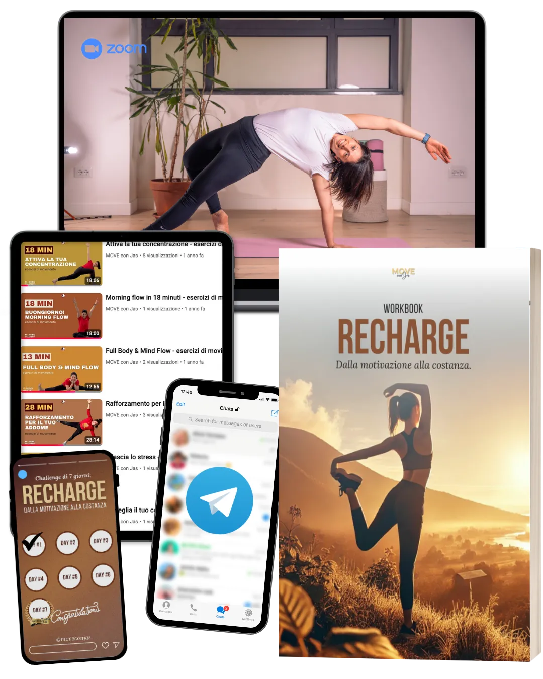 Ogni incontro della RECHARGE Challenge prevede sia movimento fisico sia brevi momenti di respirazione e journaling. Gli incontri si svolgeranno ogni giorno dalle 06:15-06:45 su ZOOM (eccetto il giorno #04 e #05).