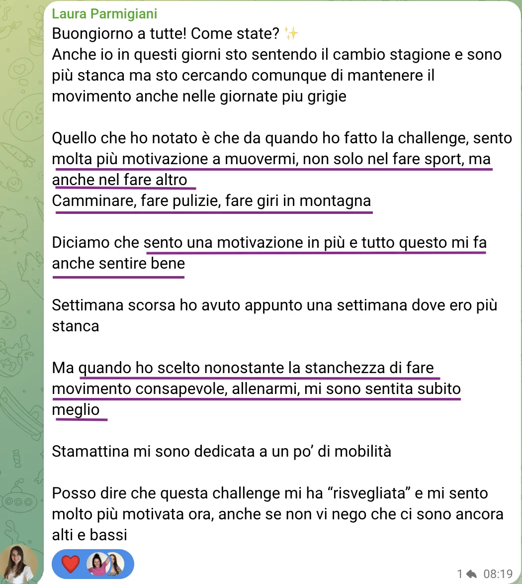 Alla fine della challenge, avrai tutte le basi per continuare a costruire la tua routine di movimento e a mantenere la motivazione alta. Sarò qui per supportarti lungo il percorso!